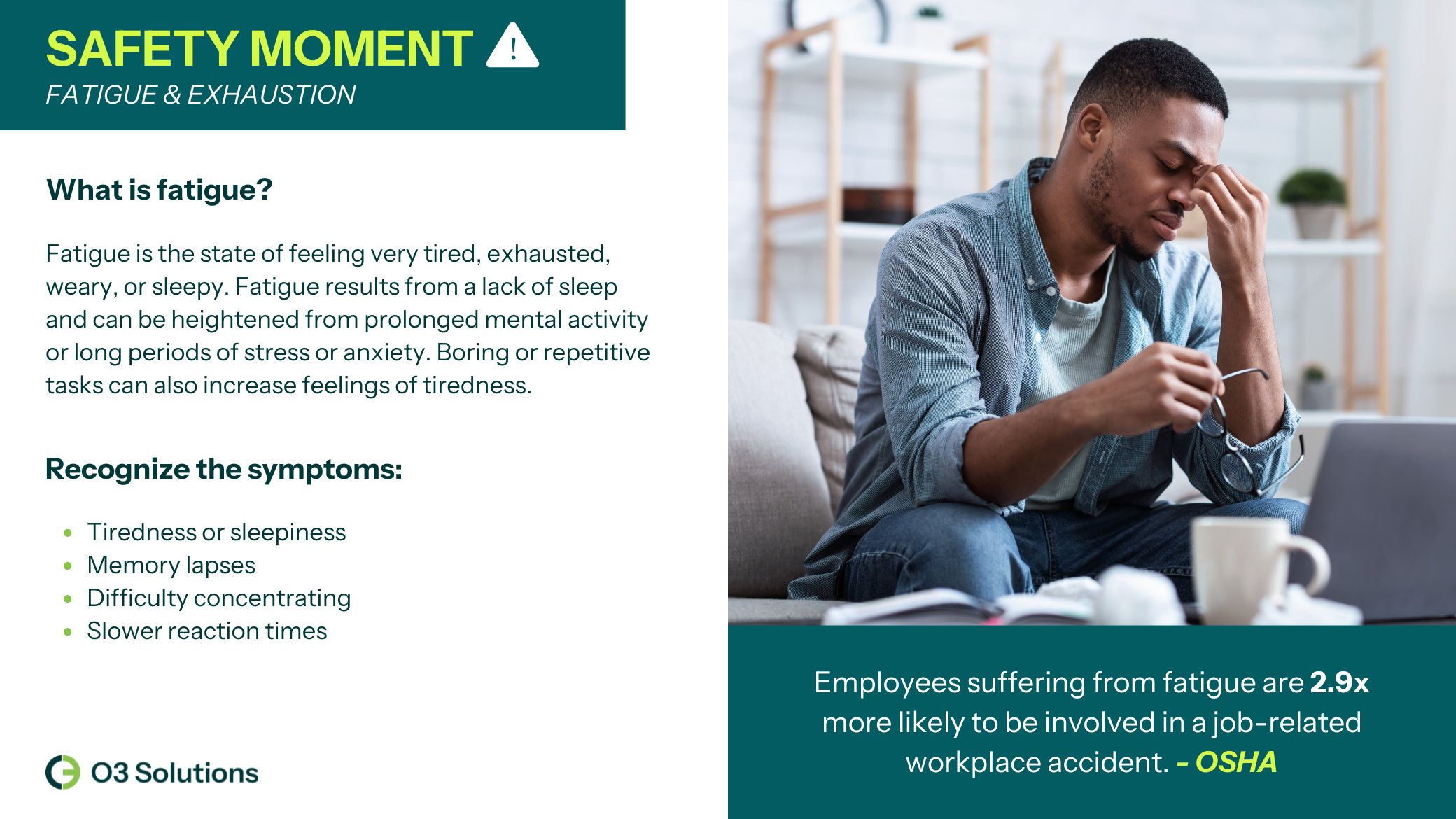 In this safety moment, we explore fatigue and exhaustion. Download now for your next presentation.